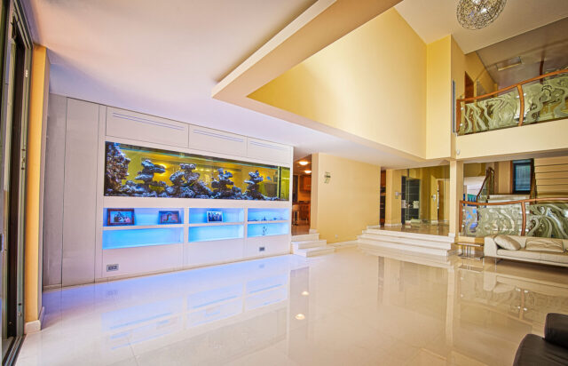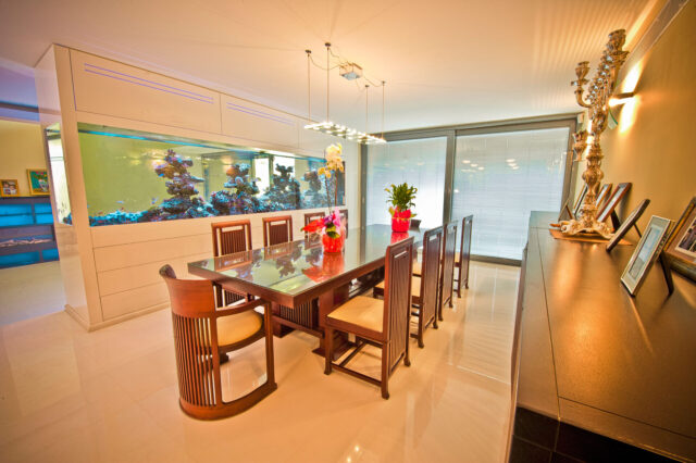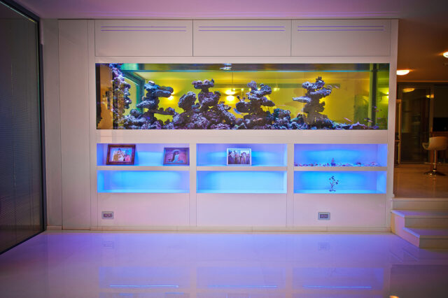 האקווריום מתוכנן לריף אלמוגים. כ 2400 ליטר מערכת הסינון תוכננה מראש, וממוקמת בגינה של הלקוח.