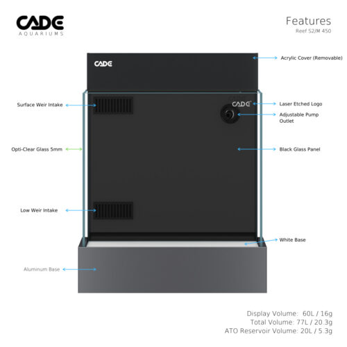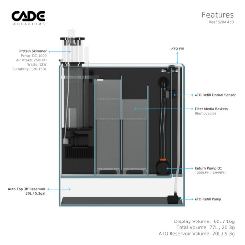 אקווריום ה נאנו של Cade Australia הינו היחידי והראשון בעולם הכולל מיכל אגירה דול של 20 ליטר בקרקעית המיכל למערכת מילוי מים אוטומטית (לא כלול). אין צורך למלא בכל יום ליטר או 2 של מי אוסמוזה המתאדים בכל יום.