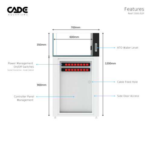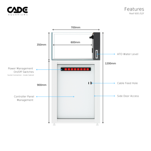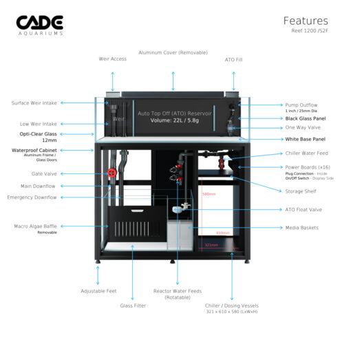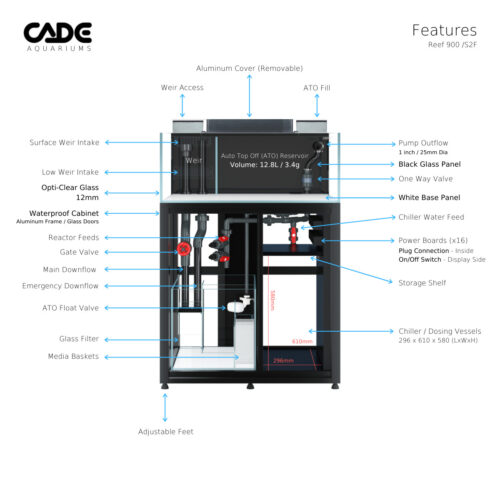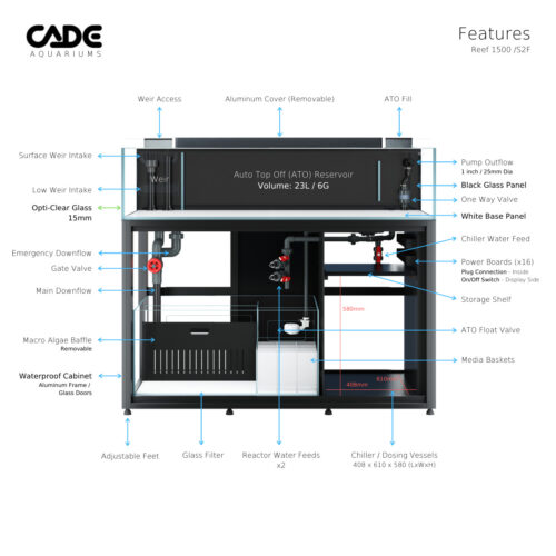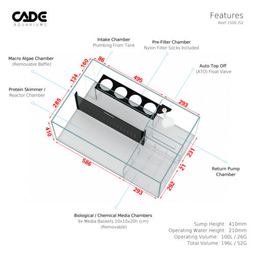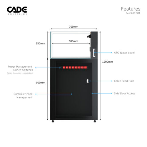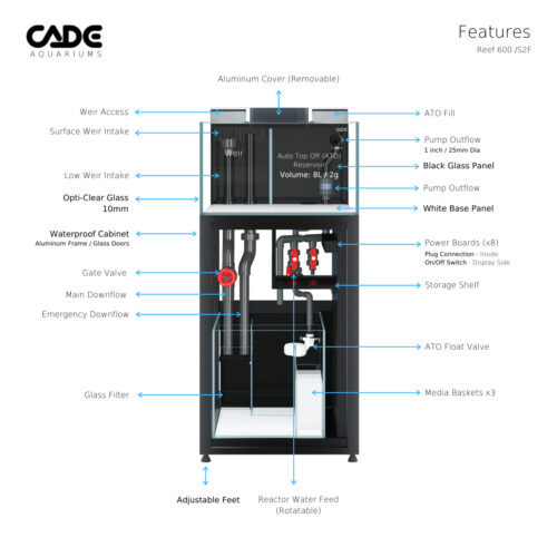 אקווריומי Cade ידועים בקווים הנקיים, השקיפות המדהימה, תכנון חכם, מיכל אגירה גדול, סאמפ בתכנון קפדני. ארונית הבנויה לעילה.